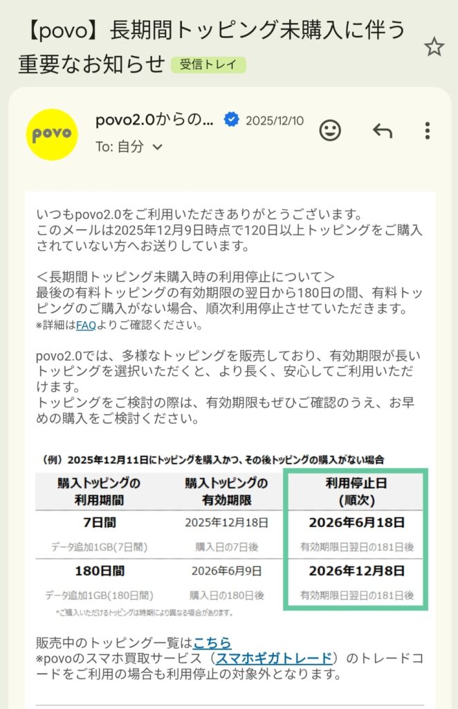 大丈夫。povoはちゃんと事前に教えてくれるよ。実際に私のところに届いたメールを見てごらん。